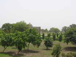 May 28, 2003 is our third anniversary. Although we will be officially celebrating in style by staying at the stunning Lake Palace in Udaipur, where the James Bond film, "Octopussy" was filmed, we are planning to end today with a big slap up meal at the best restaurant in town. It is located in one of the five star hotels in which we are not staying. To build up our appetites we will do the greatest amount of sightseeing in any of the three days we are staying in Delhi. Today begins with Purana Quila, Humayan's tomb, a drive past the Parliament buildings and down the main drive to the India Gate. A walk through the B'hai Lotus Temple and a visit to the resting place of Mahatma Gandhi's ashes will end a day of sightseeing that begins and ends with us burning our bare feet on the many stone surfaces surrounding places of worship and respect. No shopping will be done today, although our newly tailored (soon-to-fall-apart) clothes will have to be delivered to our hotel before we go for dinner. Raju, our guide, meets us at our hotel and we follow his swift pace through winding side streets to the awaiting car. Sanju, the driver, spots us from a distance and times his exit from the driver's seat to open Julie's door before we can reach it ourselves. Once in the car, a/c blowing, Raju asks us, "Where do you want to go?" Anticipating the typical tourist's desires he adds, "Red Fort?" He seems surprised when we announce our desire to see Purana Quila. Although he does not question us, we explain that we do not yet have a great sense of the size of Delhi and had just read in a guidebook that Purana Quila offers a view of the whole city. We ask him if this is the case and his response is simply that not many people go there. We ask if it is worth the visit and he shrugs. Saying only that it is a popular place for couples he does not answer the direct question, so we are off to Purana Quila. However, before we've gone more than a few blocks, the car stops and Raju leaps out and into a shop. We have an inkling of what is about to happen. They know that today is our anniversary and they have hinted at doing something special for us. A few minutes later, Sanju leaves the car too and soon they come out from the shop, open-mouth smiles across their faces, carrying an envelope that is wider than our backpacks. They present us with what has to be one of the largest anniversary cards designed in the 1970s, along with a rose for each of us. The card has a couple of dirt marks on it but it is touching to have our anniversary recognised by two men who have known us for two days. back to top Purana Quila Driving on to Purana Quila, we are amazed by the prolific use of roadside advertising by the cell phone company 'Hutch.' Repetitive groups of posters are attached to anything vertical on the sides of the street. Often the company has build their own vertical posts because there was nothing onto which they could otherwise be attached. We ask Raju about renting a phone and he says it is simply not possible. We decide we might have to buy one while in Calcutta, as Julie is positively aghast at the idea of living without a cell phone for three months. Foresight: the cell phone would prove to be quite handy and Marcus will eventually be very glad we had it!As we arrive at the site, Raju does not have the same protective attitude for hawkers he displayed at the Qutab Minar. The only people selling things are selling to the locals; there are no postcards, no peacock feathers or gold painted plastic necklaces to be sold in a place where tourists rarely come. We are able to park the car some distance from the site entrance (giving the car shelter under a tree) and realise, on our longer walk to the payment window, that we have left the camera in a bag in the car. Without hesitation Sanju runs back to fetch it and, as he hands it to me, I feel a touch of colonial abuse - I had not protested his departure too strongly. Even the entrance fee for foreigners is not high at this site -- only Rps. 100 for all of us instead of the Qutab Minar's Rps. 150 apiece. When we walk through the entrance gate we are delighted by the numerous and well-irrigated lawns before us. There is a surplus of water in what we imagine to be a drought before the monsoon and we soon understand Raju's comment about couples. We have had to adjust to the fact that in public, walking down the street, sitting in restaurants or while on public transport, men and women do not touch. In Purana Quila young couples come to lie under trees together or to wander the grounds with their fore-fingers interlinked. Almost all of these young lovers do so without the knowledge of their families who still see the benefits of arranged marriages. We learn during our time here that love marriages have grown to about 30% of all marriages in India. Raju and Sanju find a shady tree to sit under as we try to locate the supposed view of the city. We decide that the walls of Purana Quila are the most likely place to climb high and, as we walk towards them at 10 am, we drink deeply from our water bottles. The temperature is already in the high 30's. Steps in all the sites, and in fact even in modern buildings, are not always a standard height. In renovations the irregular step height has been maintained and even in mountain temples the steps up to the deity are designed to make the short-legged devotee make a strenuous effort to cherish their god. We climb as high as the renovations allow and see nothing but haze. There is a vague sense that the city is out there, but there is nothing to see except another old building in the close distance. Walking back on the ground level we see a woman filling a bucket using a hand pump. She is surrounded by wasps and does nothing to show concern about being stung. She is barefooted and, when her bucket is full, she simply walks away and the wasps await the next person to ignore. We take a look at the ruins in Purana Quila and they appear very s