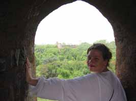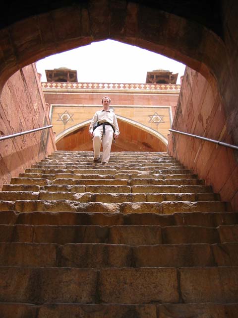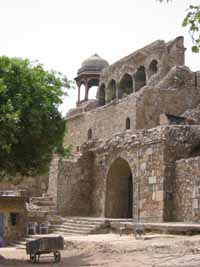 May 28, 2003 is our third anniversary. Although we will be officially celebrating in style by staying at the stunning Lake Palace in Udaipur, where the James Bond film, "Octopussy" was filmed, we are planning to end today with a big slap up meal at the best restaurant in town. It is located in one of the five star hotels in which we are not staying. To build up our appetites we will do the greatest amount of sightseeing in any of the three days we are staying in Delhi. Today begins with Purana Quila, Humayan's tomb, a drive past the Parliament buildings and down the main drive to the India Gate. A walk through the B'hai Lotus Temple and a visit to the resting place of Mahatma Gandhi's ashes will end a day of sightseeing that begins and ends with us burning our bare feet on the many stone surfaces surrounding places of worship and respect. No shopping will be done today, although our newly tailored (soon-to-fall-apart) clothes will have to be delivered to our hotel before we go for dinner. Raju, our guide, meets us at our hotel and we follow his swift pace through winding side streets to the awaiting car. Sanju, the driver, spots us from a distance and times his exit from the driver's seat to open Julie's door before we can reach it ourselves. Once in the car, a/c blowing, Raju asks us, "Where do you want to go?" Anticipating the typical tourist's desires he adds, "Red Fort?" He seems surprised when we announce our desire to see Purana Quila. Although he does not question us, we explain that we do not yet have a great sense of the size of Delhi and had just read in a guidebook that Purana Quila offers a view of the whole city. We ask him if this is the case and his response is simply that not many people go there. We ask if it is worth the visit and he shrugs. Saying only that it is a popular place for couples he does not answer the direct question, so we are off to Purana Quila. However, before we've gone more than a few blocks, the car stops and Raju leaps out and into a shop. We have an inkling of what is about to happen. They know that today is our anniversary and they have hinted at doing something special for us. A few minutes later, Sanju leaves the car too and soon they come out from the shop, open-mouth smiles across their faces, carrying an envelope that is wider than our backpacks. They present us with what has to be one of the largest anniversary cards designed in the 1970s, along with a rose for each of us. The card has a couple of dirt marks on it but it is touching to have our anniversary recognised by two men who have known us for two days. back to top Purana Quila Driving on to Purana Quila, we are amazed by the prolific use of roadside advertising by the cell phone company 'Hutch.' Repetitive groups of posters are attached to anything vertical on the sides of the street. Often the company has build their own vertical posts because there was nothing onto which they could otherwise be attached. We ask Raju about renting a phone and he says it is simply not possible. We decide we might have to buy one while in Calcutta, as Julie is positively aghast at the idea of living without a cell phone for three months. Foresight: the cell phone would prove to be quite handy and Marcus will eventually be very glad we had it!As we arrive at the site, Raju does not have the same protective attitude for hawkers he displayed at the Qutab Minar. The only people selling things are selling to the locals; there are no postcards, no peacock feathers or gold painted plastic necklaces to be sold in a place where tourists rarely come. We are able to park the car some distance from the site entrance (giving the car shelter under a tree) and realise, on our longer walk to the payment window, that we have left the camera in a bag in the car. Without hesitation Sanju runs back to fetch it and, as he hands it to me, I feel a touch of colonial abuse - I had not protested his departure too strongly. Even the entrance fee for foreigners is not high at this site -- only Rps. 100 for all of us instead of the Qutab Minar's Rps. 150 apiece. When we walk through the entrance gate we are delighted by the numerous and well-irrigated lawns before us. There is a surplus of water in what we imagine to be a drought before the monsoon and we soon understand Raju's comment about couples. We have had to adjust to the fact that in public, walking down the street, sitting in restaurants or while on public transport, men and women do not touch. In Purana Quila young couples come to lie under trees together or to wander the grounds with their fore-fingers interlinked. Almost all of these young lovers do so without the knowledge of their families who still see the benefits of arranged marriages. We learn during our time here that love marriages have grown to about 30% of all marriages in India. Raju and Sanju find a shady tree to sit under as we try to locate the supposed view of the city. We decide that the walls of Purana Quila are the most likely place to climb high and, as we walk towards them at 10 am, we drink deeply from our water bottles. The temperature is already in the high 30's. Steps in all the sites, and in fact even in modern buildings, are not always a standard height. In renovations the irregular step height has been maintained and even in mountain temples the steps up to the deity are designed to make the short-legged devotee make a strenuous effort to cherish their god. We climb as high as the renovations allow and see nothing but haze. There is a vague sense that the city is out there, but there is nothing to see except another old building in the close distance. Walking back on the ground level we see a woman filling a bucket using a hand pump. She is surrounded by wasps and does nothing to show concern about being stung. She is barefooted and, when her bucket is full, she simply walks away and the wasps await the next person to ignore. We take a look at the ruins in Purana Quila and they appear very s